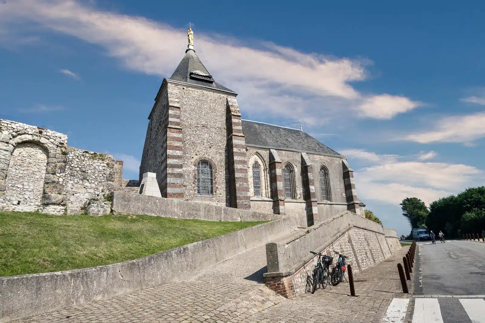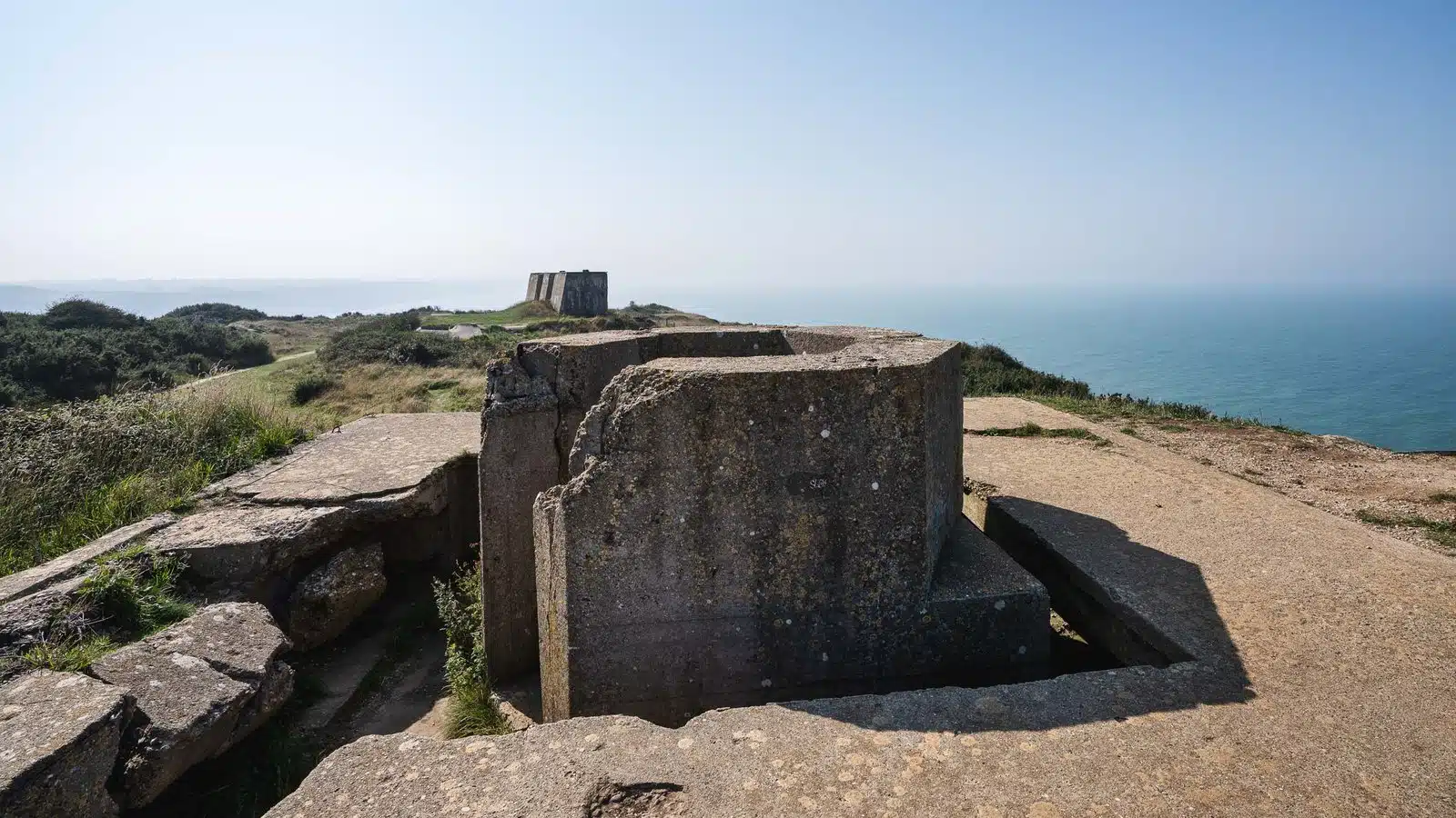 Besonders eindrucksvoll ist die Mischung aus Natur und Geschichte. Neben der kleinen Kapelle Notre-Dame-du-Salut stehen hier noch Überreste aus dem Zweiten Weltkrieg – alte Bunker und Betonreste, die heute fast still in der Landschaft liegen. Sie erinnern daran, dass dieser schöne Ort einmal Teil des Atlantikwalls war.