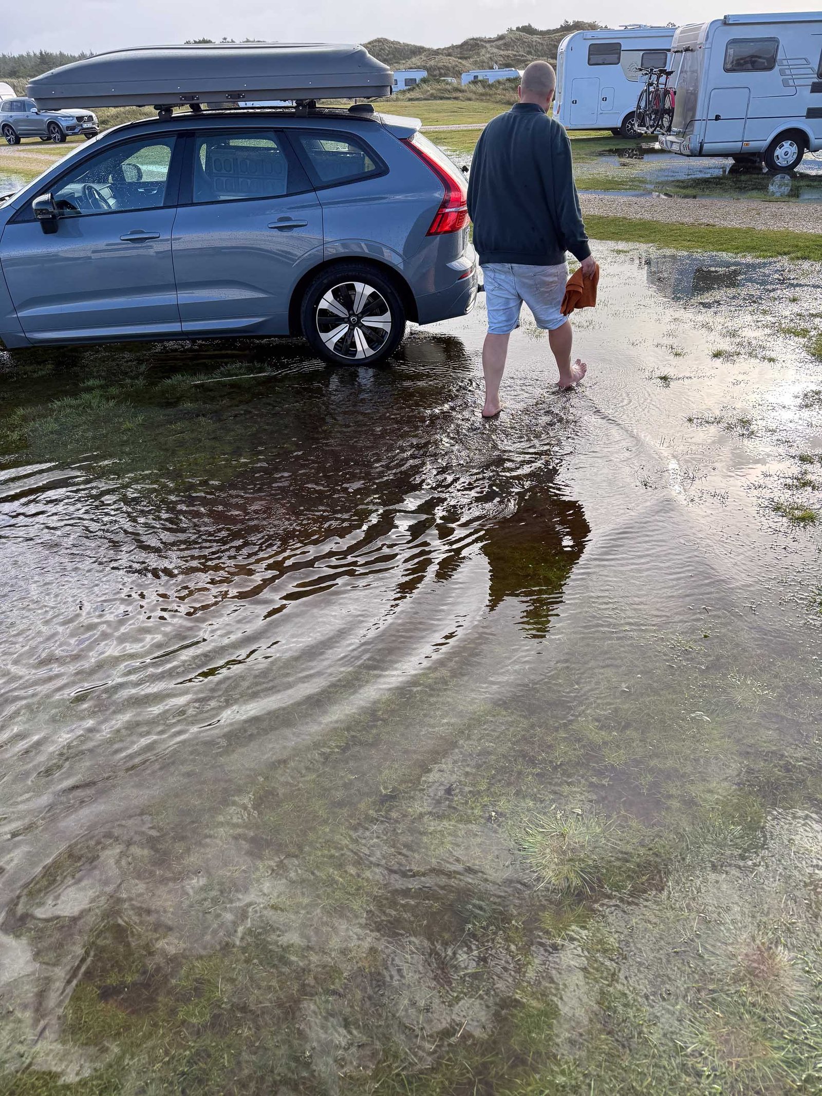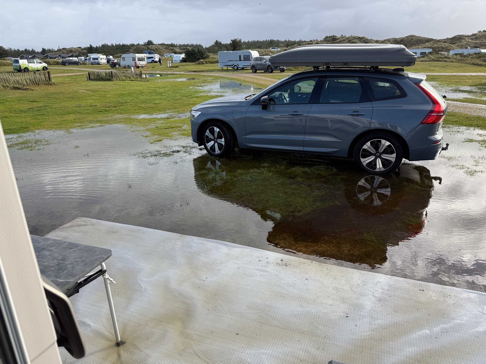 Am Morgen dann das Chaos: Alles Nass. Wirklich alles, was sich außerhalb des Wohnwagens befand. Schuhe, Wäsche, Vorräte. Und natürlich das Vorzelt selbst.