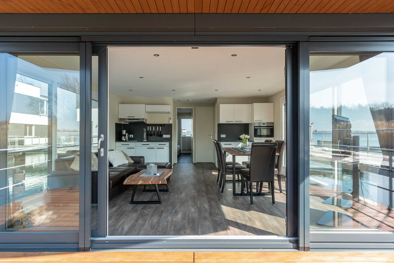 Unser schwimmendes Ferienhaus lag fest am Steg, aber die Ruhe war grenzenlos. Morgens die Kaffeemaschine an, aus den großen Panoramafenstern oder von der Terrasse schauen und einfach diesen weiten See, den Himmel und die Natur genießen – so starten Ferien, wie man sie selten erlebt. Die Terrasse wurde schnell unser Lieblingsplatz: zum Frühstücken, Sonnenbaden, Grillen, Abhängen oder einfach zum Sterne-Schauen am Abend.