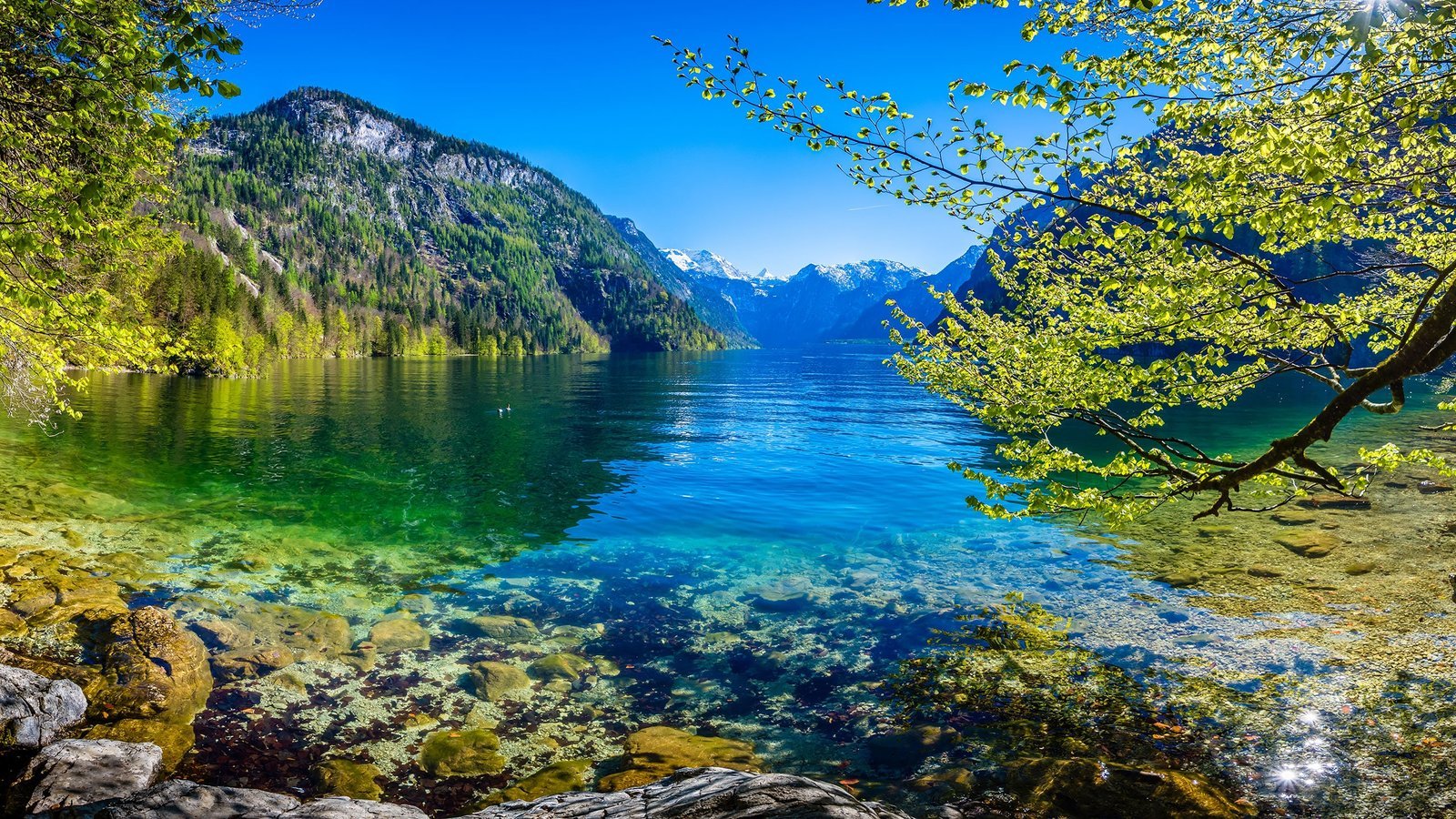 Der Königssee im Nationalpark Berchtesgaden gehört zu den eindrucksvollsten Naturwundern Deutschlands. Wenn im Abendlicht die Gipfel der Berchtesgadener Alpen im kühlen Morgenlicht aufragen, wirkt die Landschaft fast unwirklich.