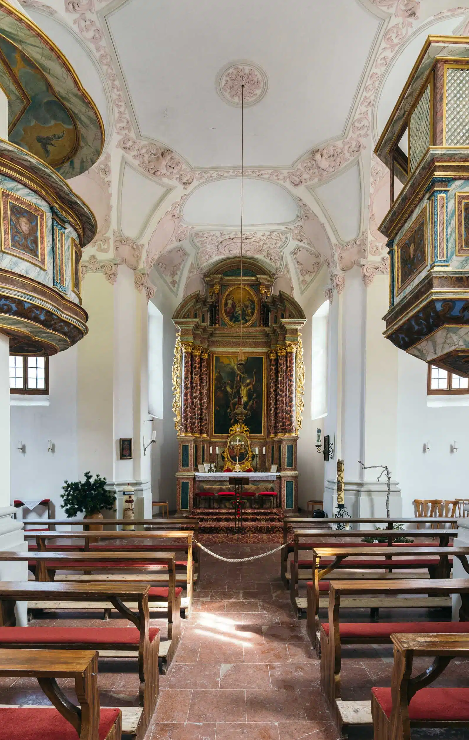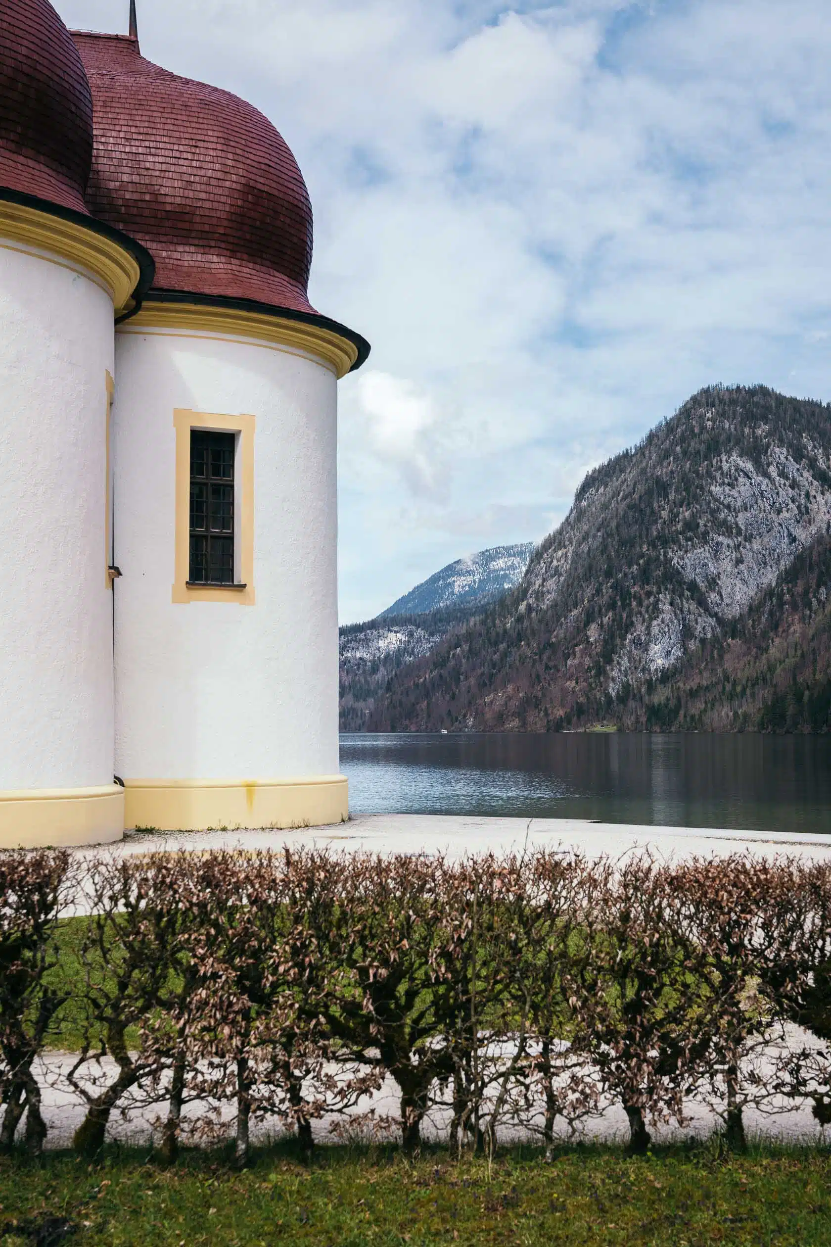Nach der Überfahrt erreicht man eines der bekanntesten Motive der Region: die Wallfahrtskirche St. Bartholomä auf der Halbinsel am Westufer des Sees. Mit ihren markanten roten Zwiebeltürmen und der weißen Fassade wirkt sie wie aus einer anderen Zeit – eingerahmt von steilen Felswänden und herbstlich gefärbten Bäumen.
