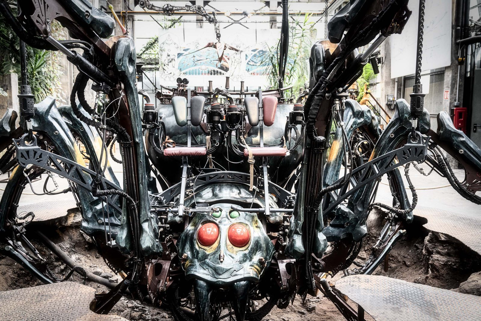 Was uns besonders fasziniert hat, ist diese rohe Ästhetik. Keine glatten Oberflächen, kein Hochglanz – stattdessen Metallplatten, Schrauben, Schweißnähte. Genau das macht diesen Ort so intensiv. Es fühlt sich an, als würde man durch eine Werkstatt laufen, in der gerade eine neue Welt erschaffen wird.