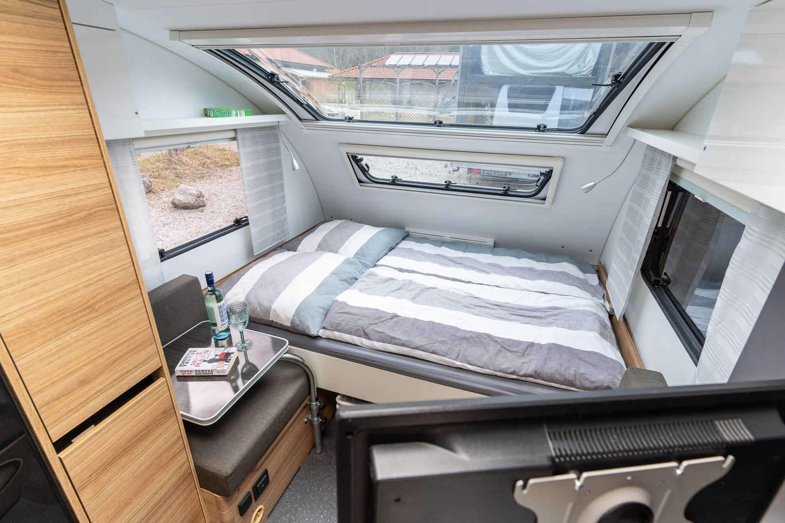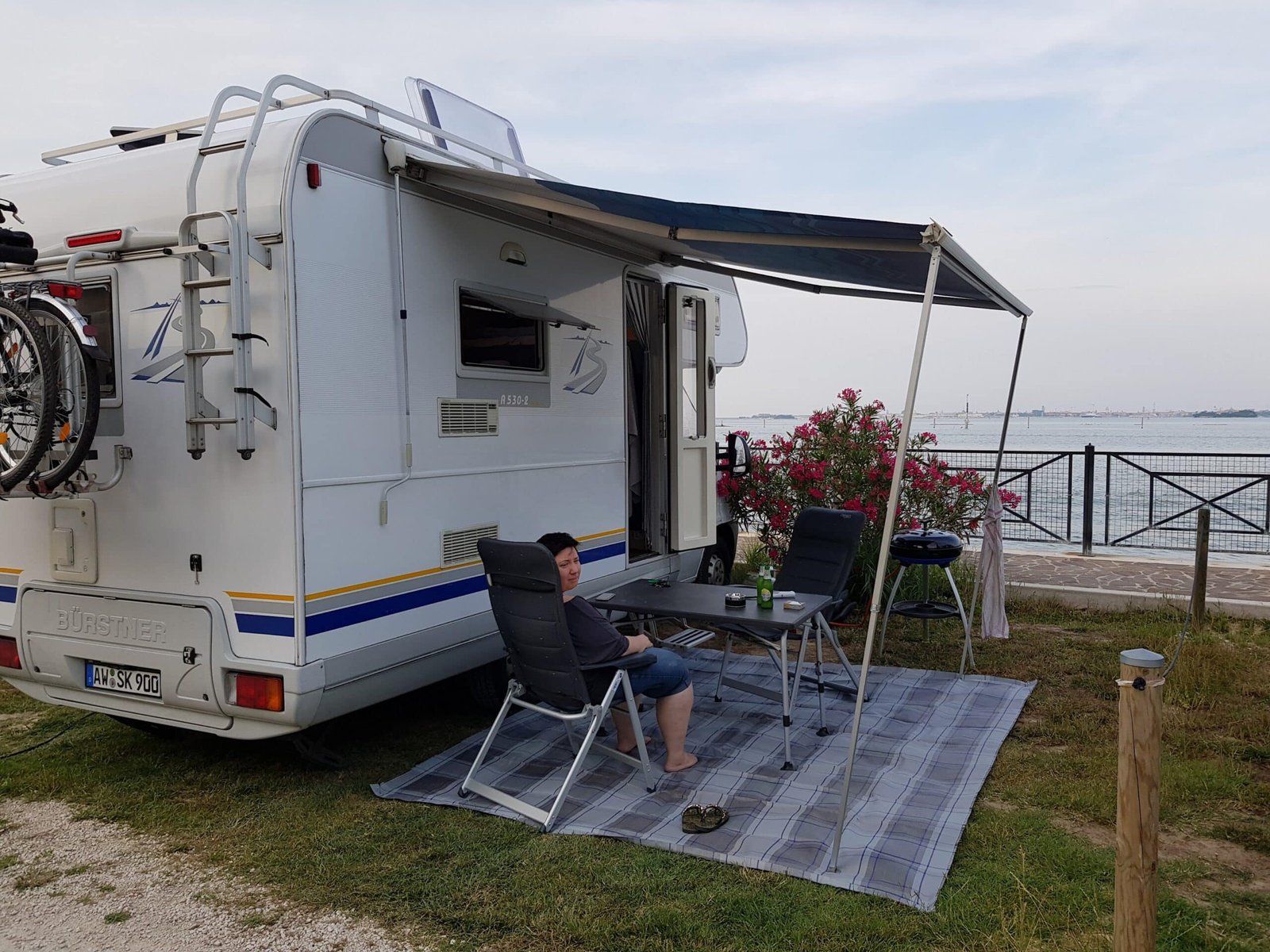 Später wurde es kleiner – ein Adria Action, unser kompakter Wohnwagen, der uns gezeigt hat, wie schön es ist, minimalistisch zu reisen. Weniger Ballast, mehr Gefühl für Orte, Menschen und Stimmungen. Den Adria haben wir umgebaut, Klappbett und feste Sitzgelegenheit. Trotzdem war es zum Arbeiten – gerade bei Regen – eng.